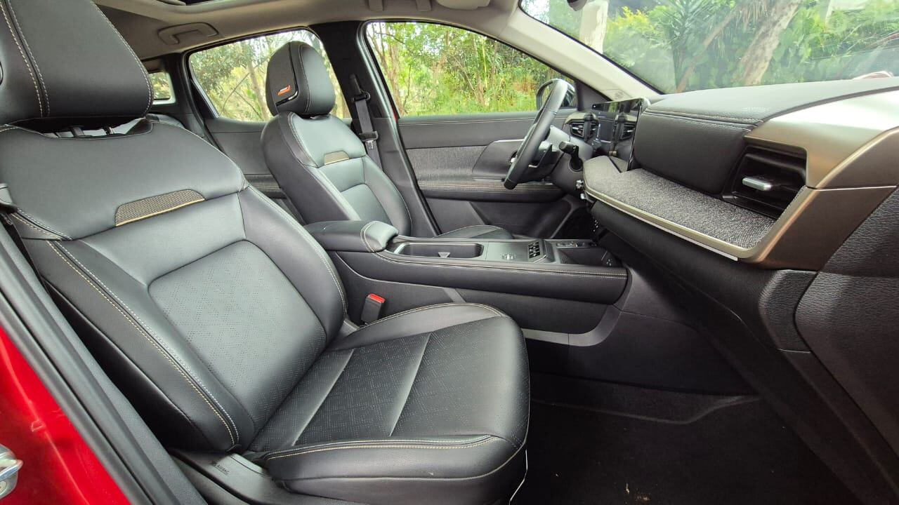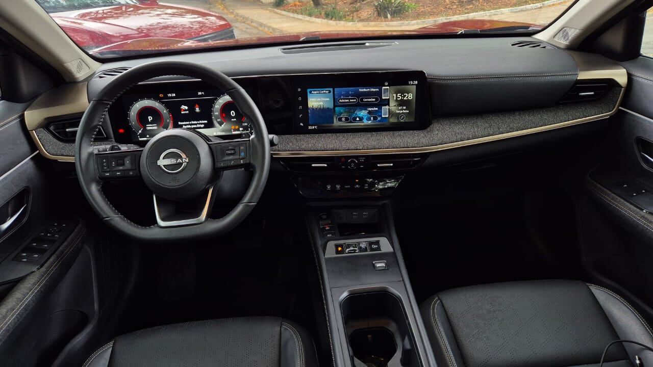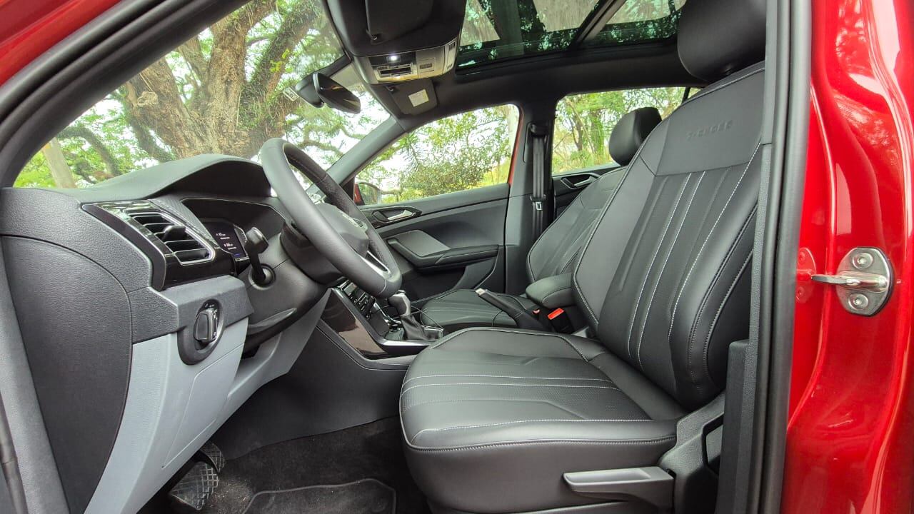 Por dentro fica evidente a diferença de proposta. O T-Cross foi renovado na linha 2026 e ganhou apenas um revestimento parcial no painel e manteve sua aparente simplicidade. No Kicks há duas telas digitais, painel soft touch integral e acabamento bem feito.