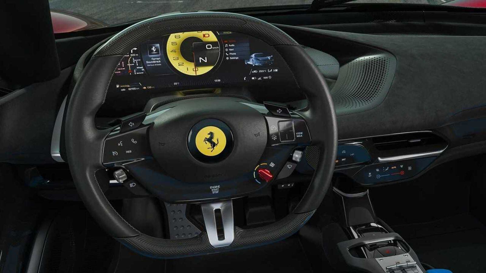 O painel tem 16 polegadas e concentra todas as informações mantendo o estilo minimalista que são a marca da Ferrari.
