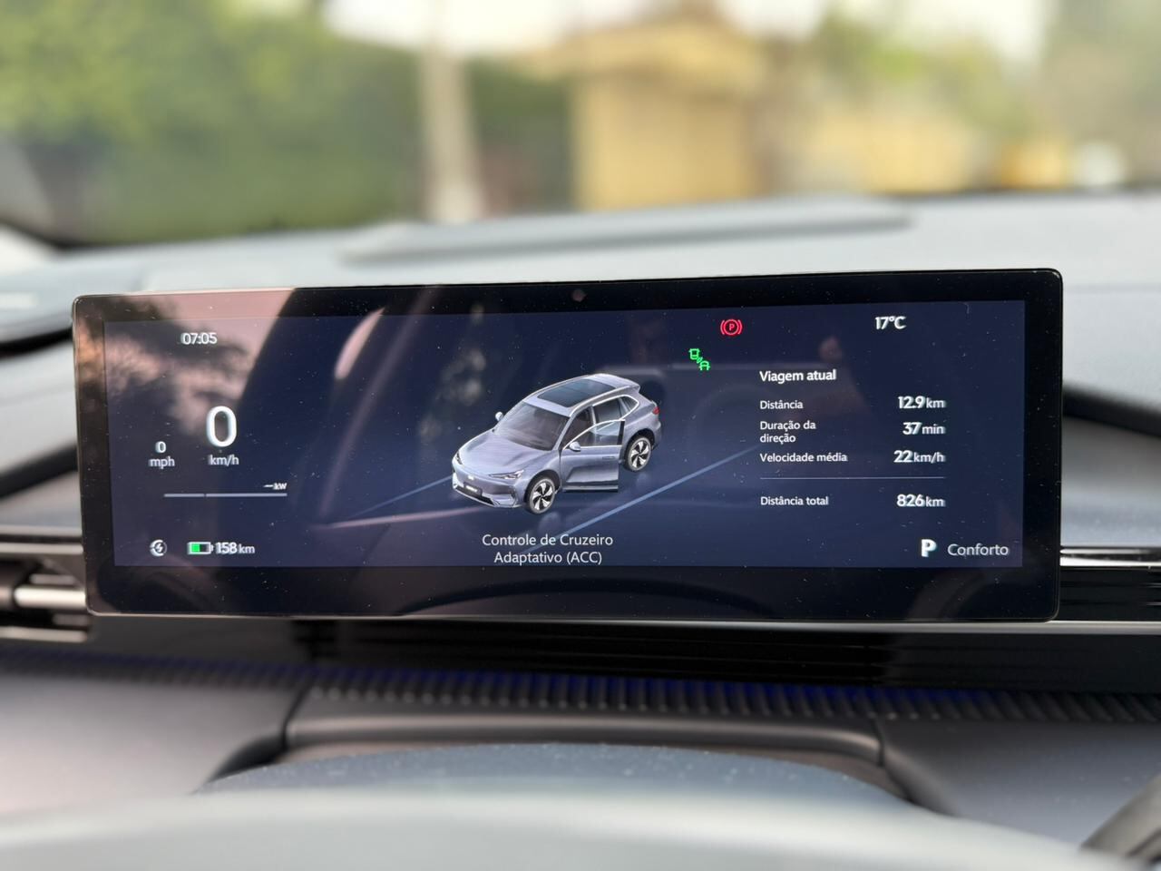 E o motor tem 217cv, bem mais que os modelos flex similares e autonomia urbana de 425km. Ao acelerar o EX5 se nota o apetite de cumprir o 0-100 em 6,9s, bem inferior aos seus rivais de porte.