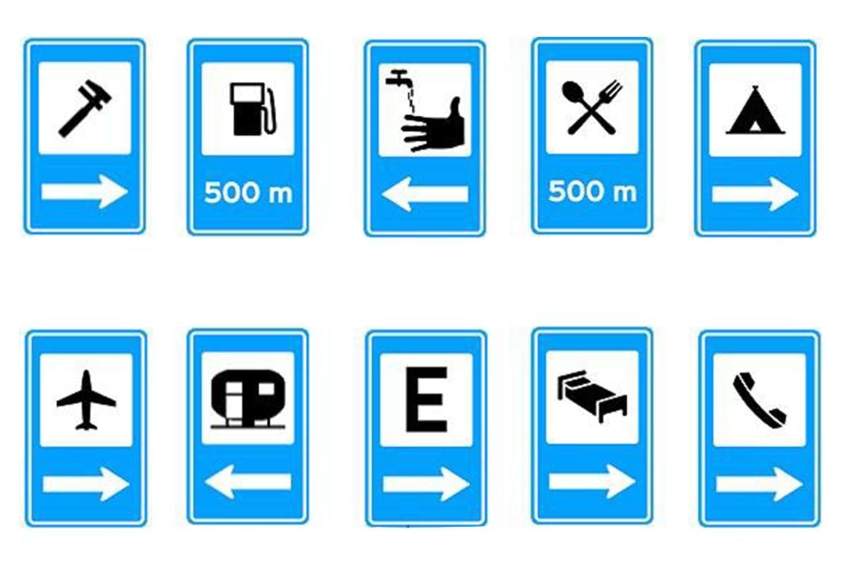 Essas placas não regulam o trânsito — elas apenas informam o que está disponível no entorno da via.