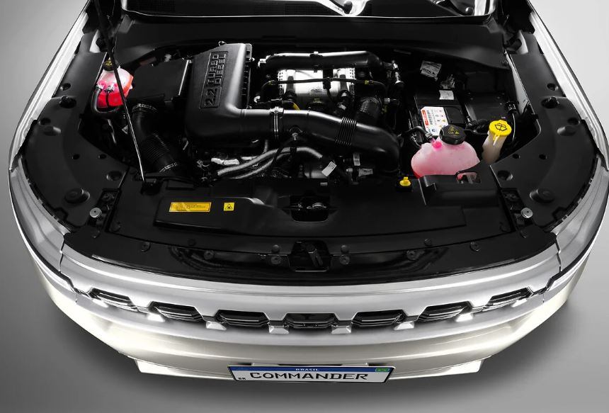 Sob o capô, o Commander segue equipado com motor 1.3 T270 turboflex, que rende até 176 CV e 270 Nm de torque com câmbio automático de 6 marchas e tração 4x2. Já a versão topo de linha Blackhawk conta com motor Hurricane 2.0T de 272 CV e 400 Nm, acelerando de 0 a 100 km/h em 7 segundos. A opção diesel Multijet 2.2 rende até 200 CV com torque 450 Nm, associada a câmbio automático de 9 marchas e tração 4x4 Jeep Active Drive Low.