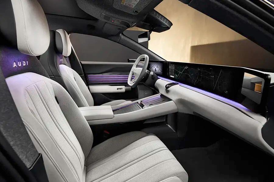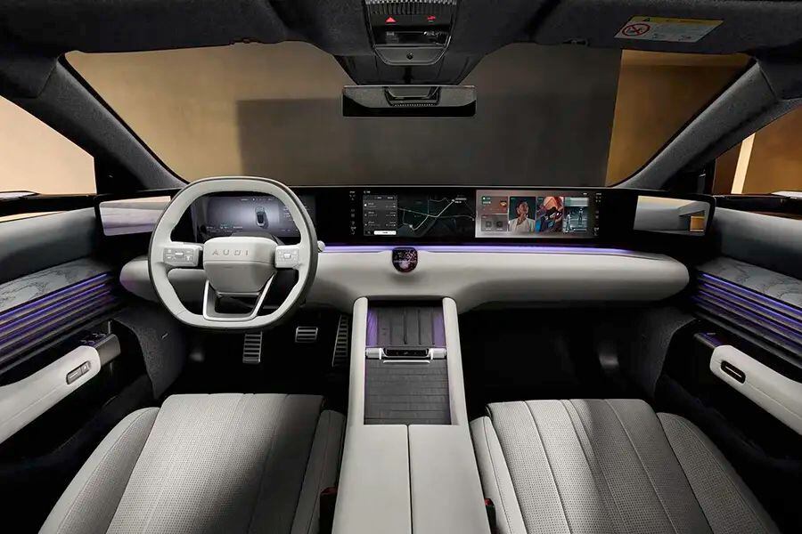A cabine adota layout que integra painel digital, multimídia central e display para o passageiro. As câmeras laterais projetam imagens em telas posicionadas como “orelhas” do conjunto. O sistema operacional é o Audi OS, rodando no chip Qualcomm Snapdragon 8295, com assistente virtual baseado no modelo de linguagem Volcano Engine Douban, que possibilita interação por comandos de voz em múltiplas rodadas de diálogo.