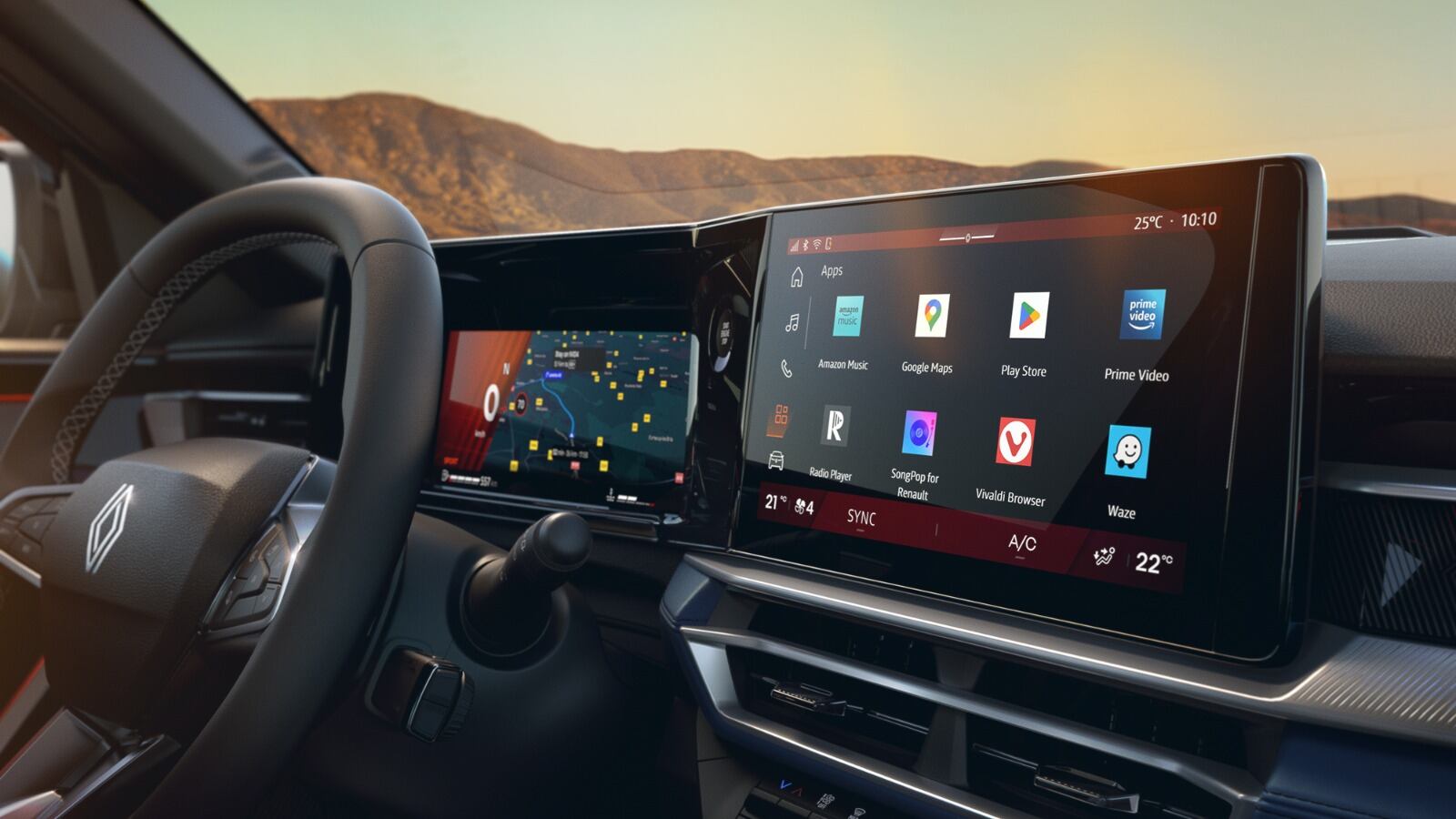 A interface Google é nativa e som é “imersivo” segundo a Renault. O interior é inspirado no Renault 4 E-Tech elétrico, com o painel duplo horizontal OpenR. São 10 e 10 polegadas Open R Link com aplicativos - Spotify, Deezer, Amazon Music, etc.), serviços de streaming (YouTube, Netflix, etc.), ferramentas de navegação alternativas (Waze), seleção de 48 cores internas, jogos e navegadores de internet com atualização automática e câmera 360°.