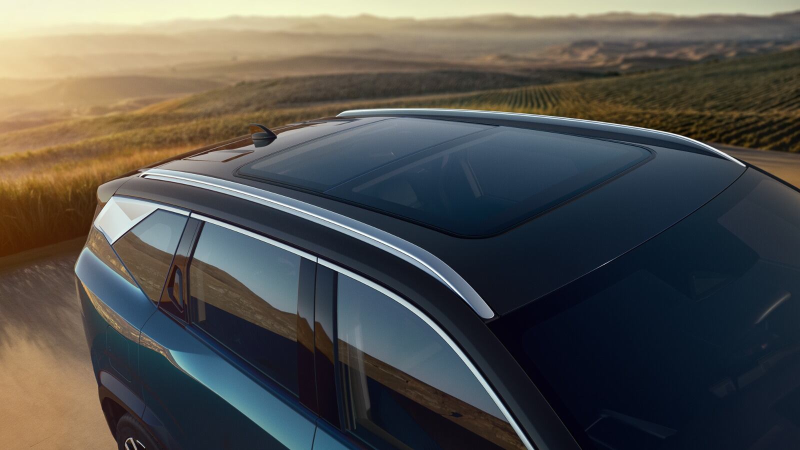 O desenho é angular e geométrico com assinatura luminosa ampla na frente, faróis em C com moldura integrada, grade com linhas quadradas, rodas aro 19, teto solar panorâmico e na traseira lanternas afiladas e porte de carroceria elevado.