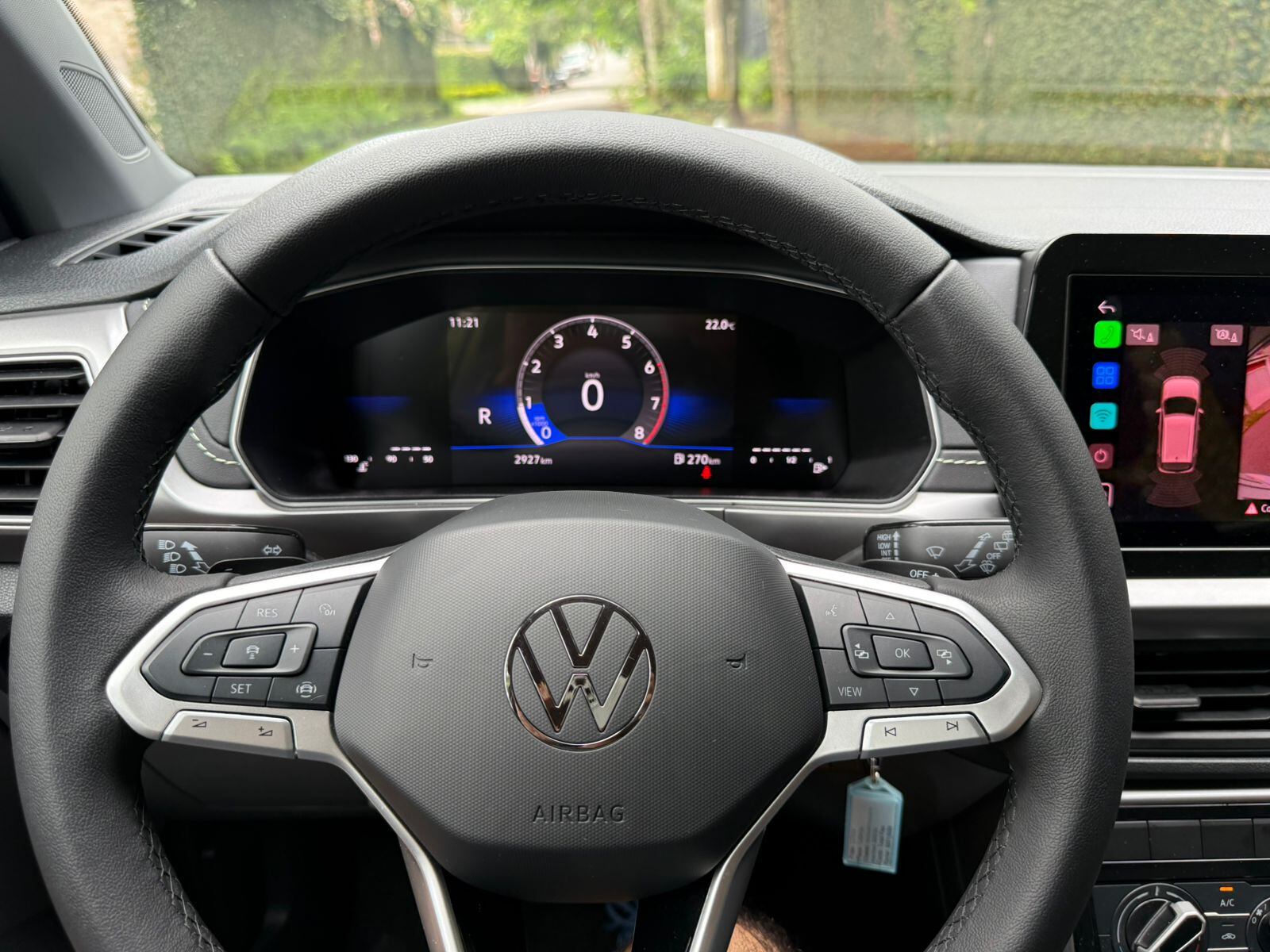 Itens de série T-Cross 200TSI O VW T-Cross 200 TSI inclui de série seis airbags, ar-condicionado manual, central multimídia VW Play de 10,1 polegadas, painel digital de 8″, rodas de liga leve aro 16, volante multifuncional, sensores de estacionamento traseiros, controle de cruzeiro adaptativo, frenagem automática de emergência, assistente de partida em rampas e sensores de estacionamento traseiros. A versão básica também possui sistema de fixação ISOFIX e lanternas em LED.