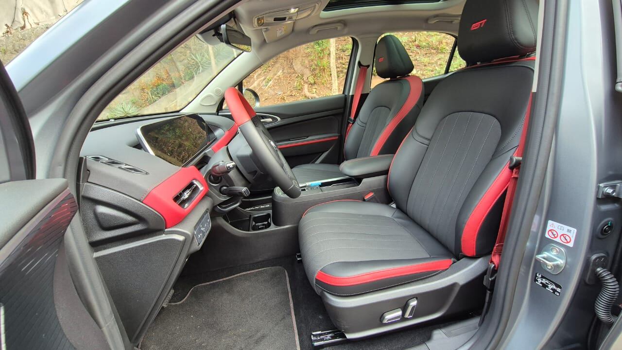 Por dentro, não há mudanças, o Ora 03 GT continua com acabamento escurecido com vermelho, destacando esportividade. O modelo continua com duas amplas telas de 10,25 polegadas cada, sendo uma de painel digital e outra de multimídia, que ganhou conexão do aplicativo My GWM, permitindo ajustar várias funções do veículo e que outras marcas também oferecem.