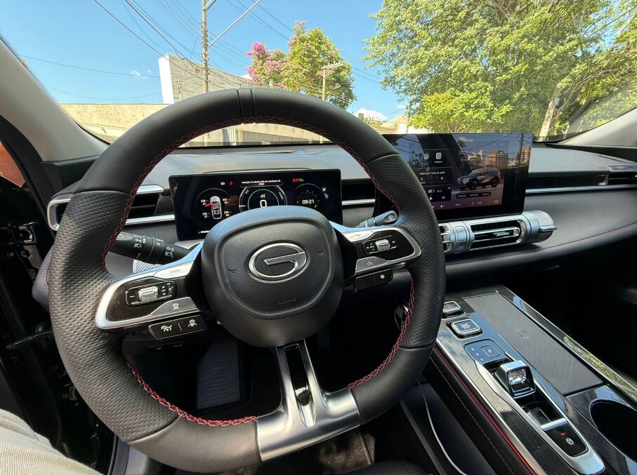 Por dentro fica presente o bom acabamento mesclando couro e a boa qualidade dos chineses. O painel, porém, fica recuado e um pouco mais baixo do que o esperado. O volante é abaulado, no tamanho certo, e o painel é digital de 10,2 polegadas podendo ser menor de 7 na versão de entrada. A multimídia não é grande demais e traz 10 polegadas do tamanho certo. Chama a atenção o bom acabamento dos encaixes que são metálicos e ajudam a transmitir mais qualidade no acabamento.