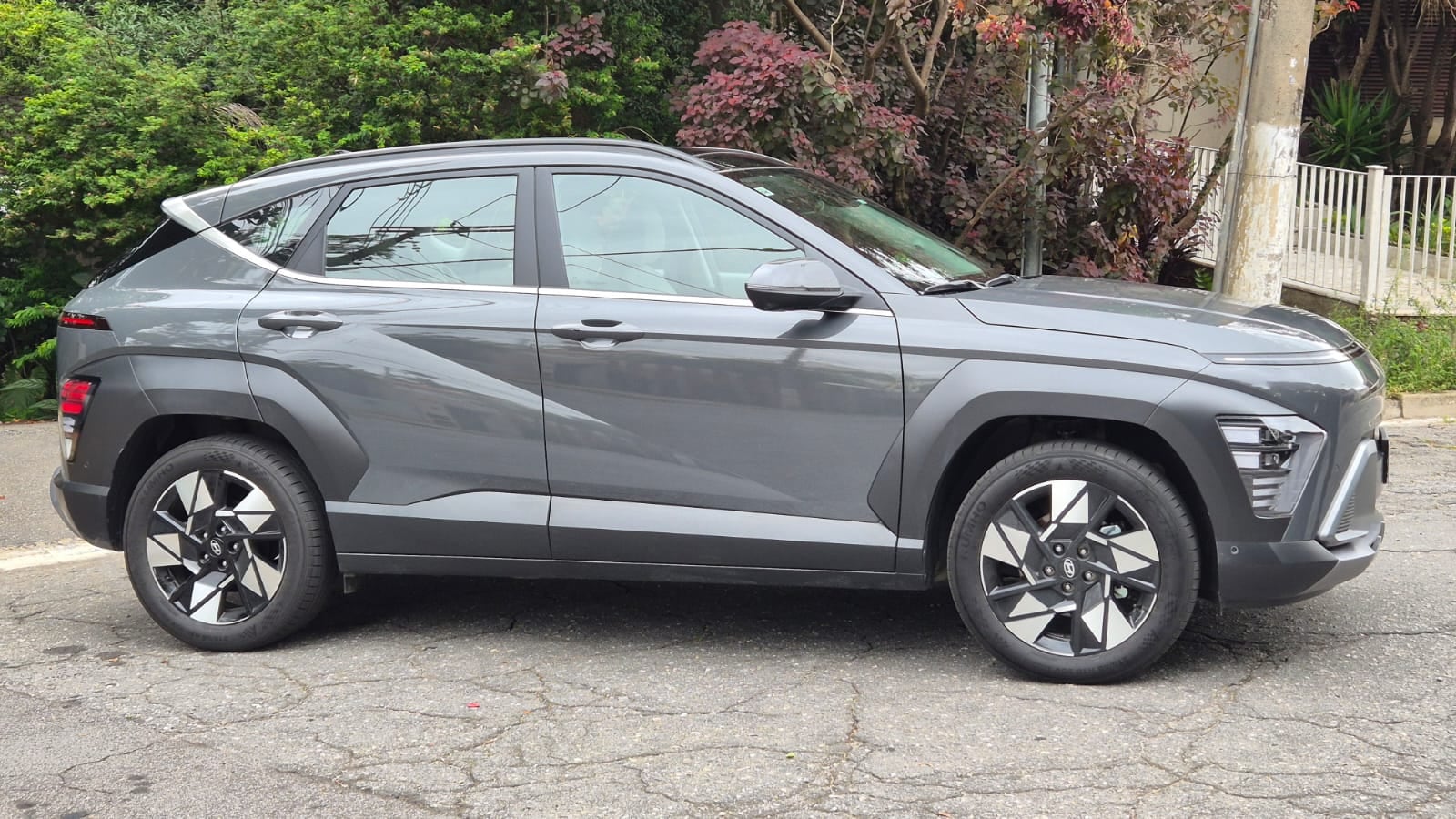 O Kona segue a linguagem visual global da Hyundai, com frente fechada, iluminação em LED contínua e linhas que remetem a veículos elétricos. A proposta combina características de hatch e SUV. As rodas de 18 polegadas, pneus 215/55 e detalhes em cinza substituem cromados. A cor cinza metálica reforça a identidade visual. Esses elementos já aparecem em protótipos do novo HB20 em testes no Brasil.