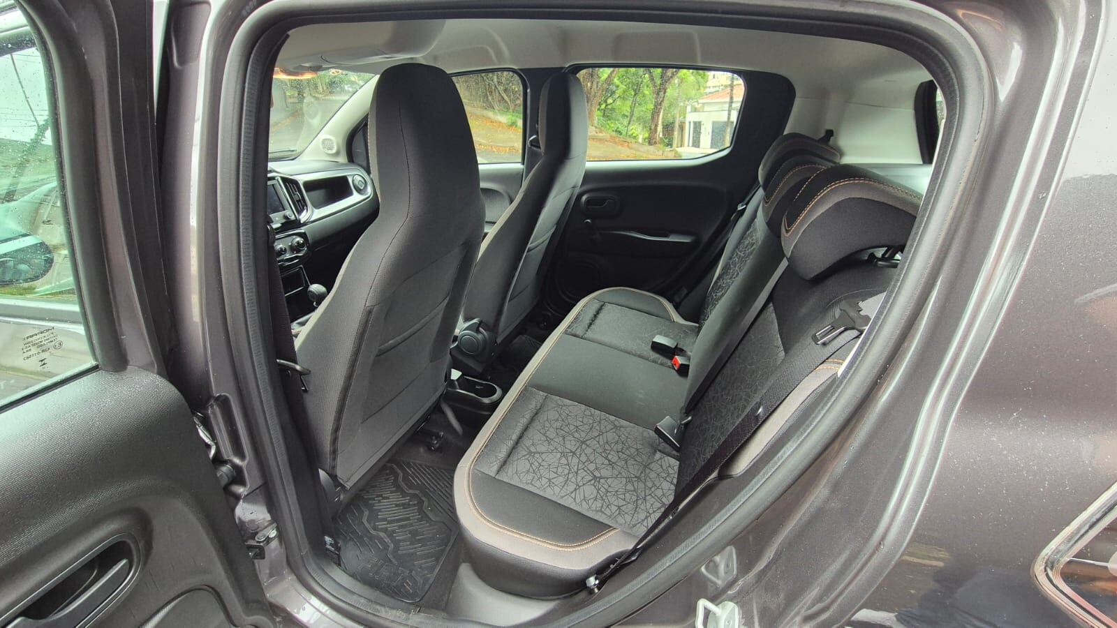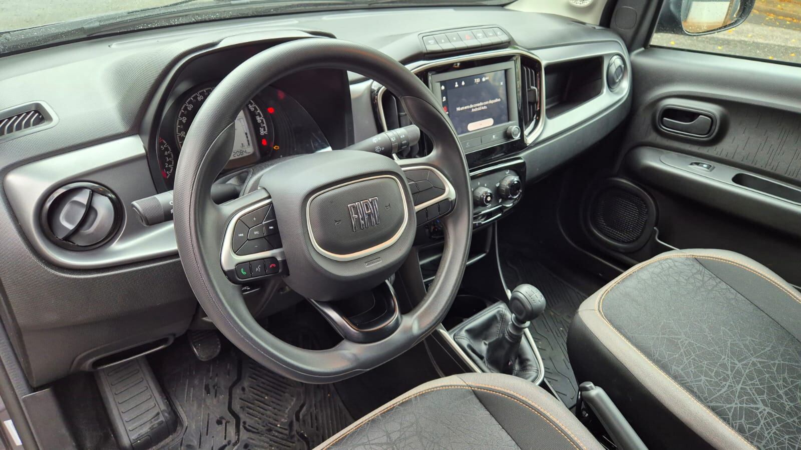 Por dentro, o Mobi mantém proposta simples. Há vidros elétricos só na frente e comandos básicos. A versão sem pacote extra não adiciona itens de conforto. O espaço vertical é favorecido pelo teto alto. A central multimídia Uconnect de 7’’ oferece conexão sem fio com Android Auto e Apple CarPlay e operação estável.