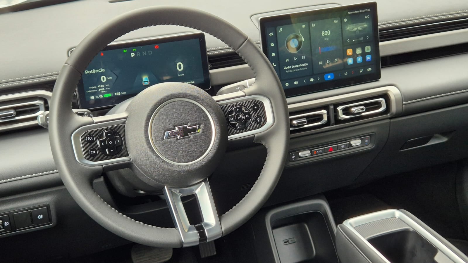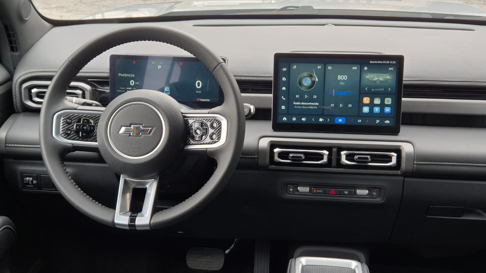 A Chevrolet optou por manter botões físicos para o ar-condicionado, o que facilita o uso no dia a dia. O acabamento é correto para a categoria, com boa montagem e materiais compatíveis com a proposta. Em contrapartida, o sistema multimídia oferece Apple CarPlay e Android Auto apenas com fio, e o modelo não conta com o serviço OnStar, comum em outros produtos da marca.