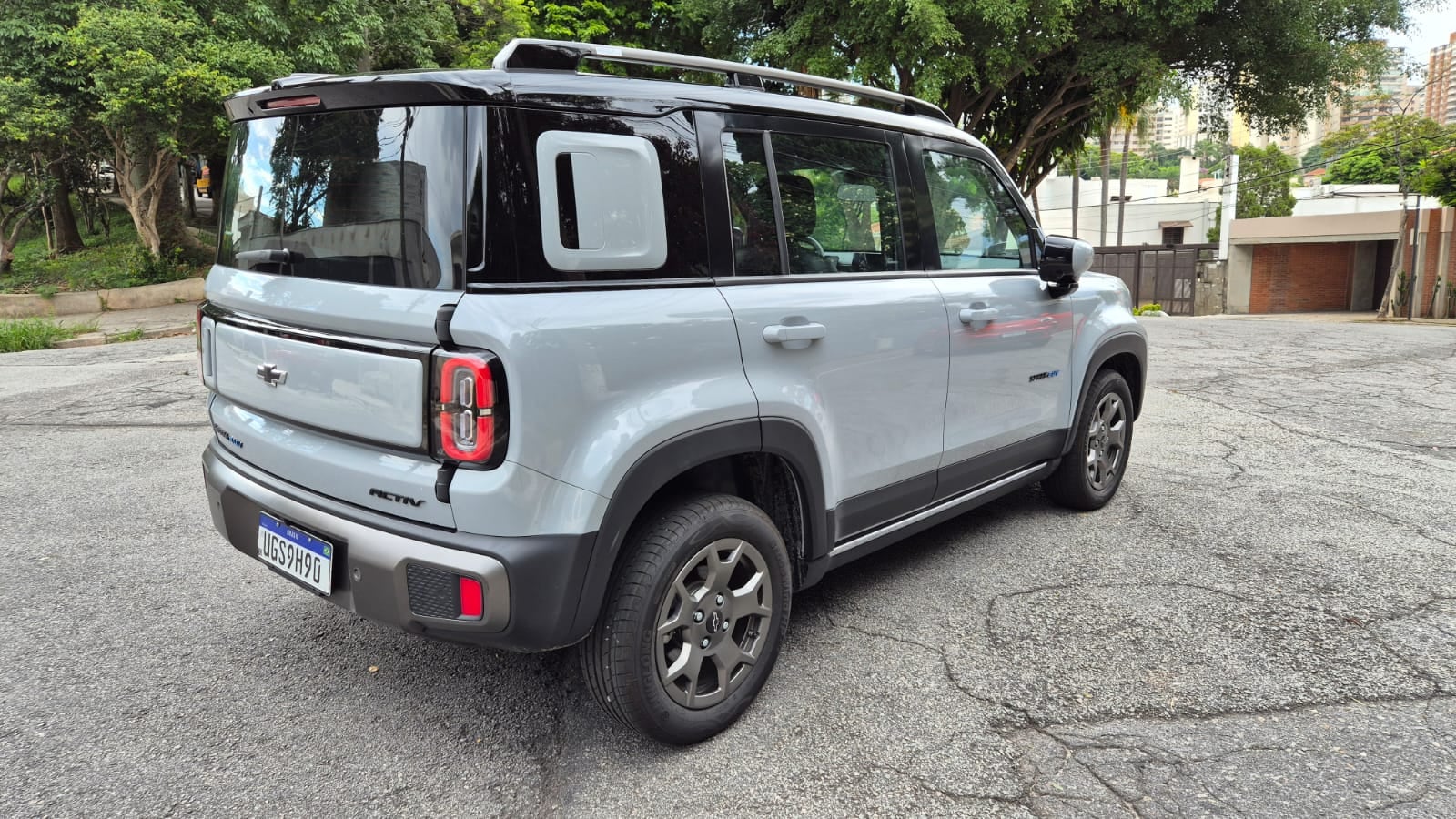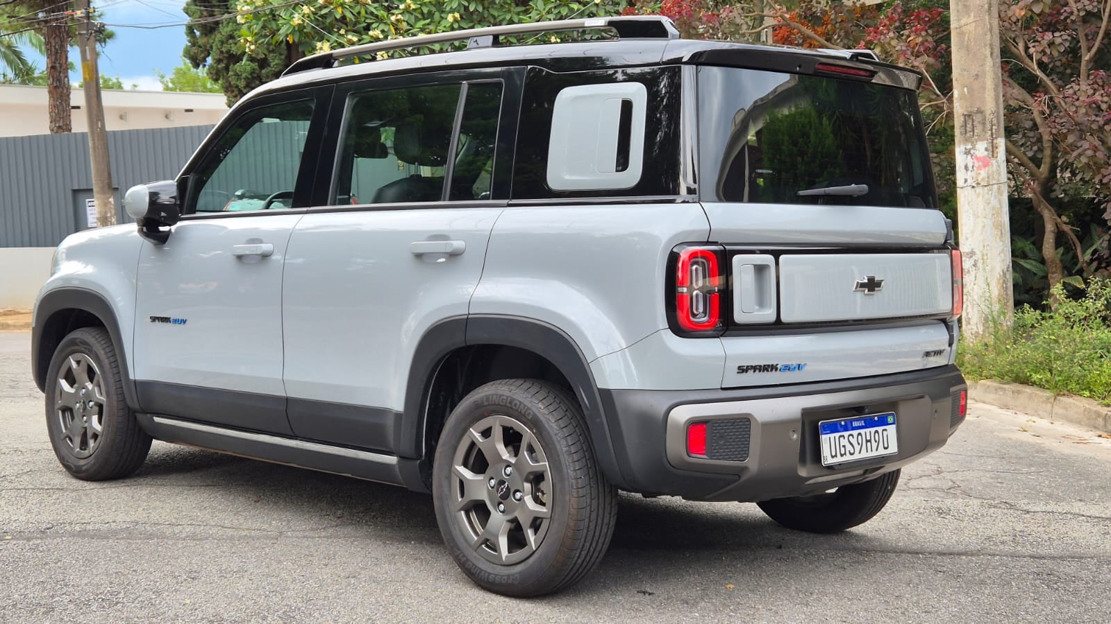 Enquanto boa parte dos elétricos compactos aposta em linhas aerodinâmicas e perfil baixo, o Spark EUV segue outro caminho. A carroceria mais alta, o desenho quadrado e os volumes bem marcados remetem a modelos como Jeep Renegade e Ford Bronco, ainda que o uso seja claramente urbano.