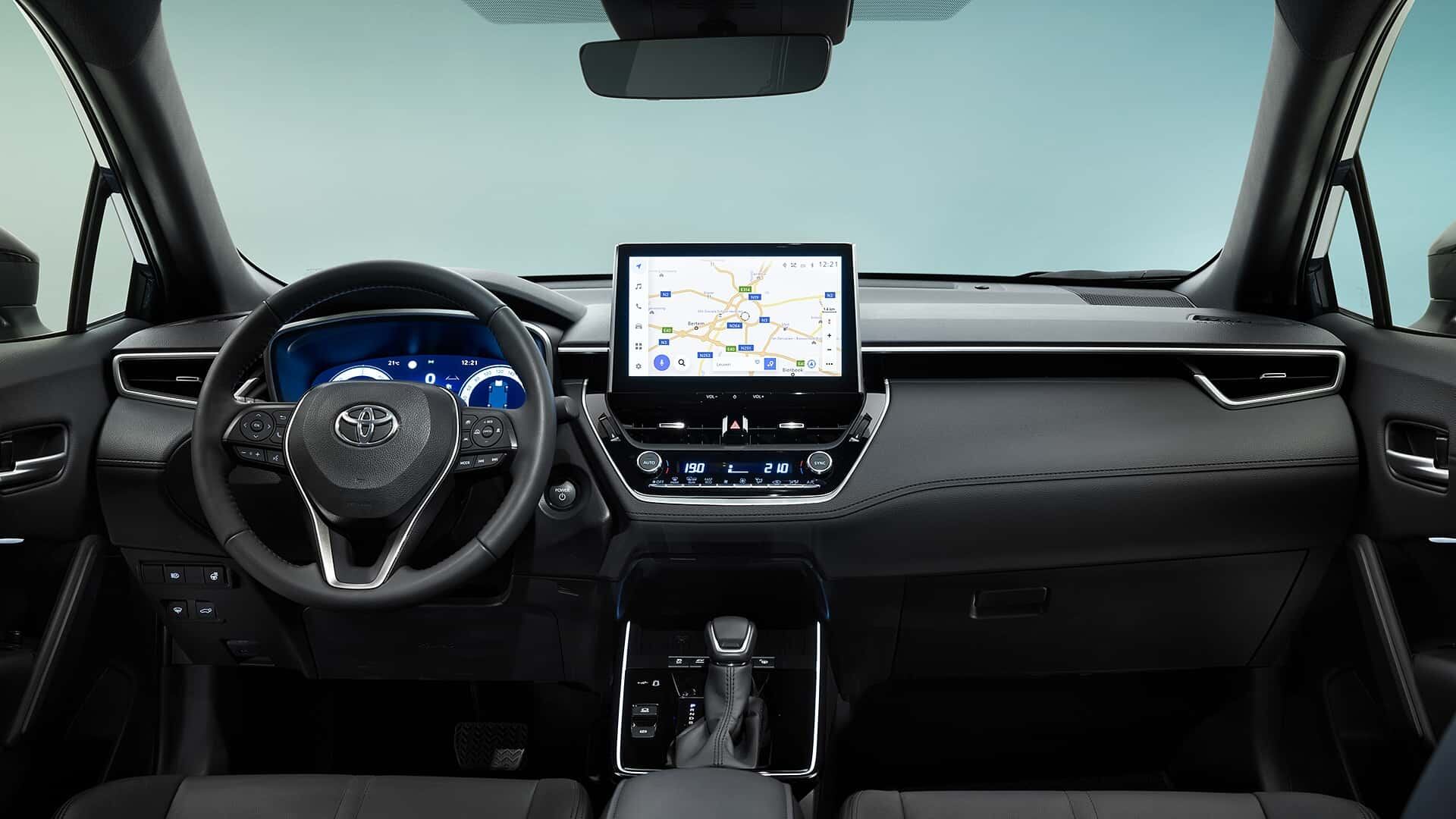 A versão GR-Sport do Toyota Corolla Cross europeu tem uma grade convencional de grande porte, mas segue com os mesmos faróis dianteiros e lanternas traseiras do brasileiro. Já as configurações híbridas têm desenho igual ao modelo vendido por aqui. O interior diferente do brasileiro pode ter painel de instrumentos de 7 ou 10 polegadas, já a central multimídia é de 10 polegadas como o nacional.