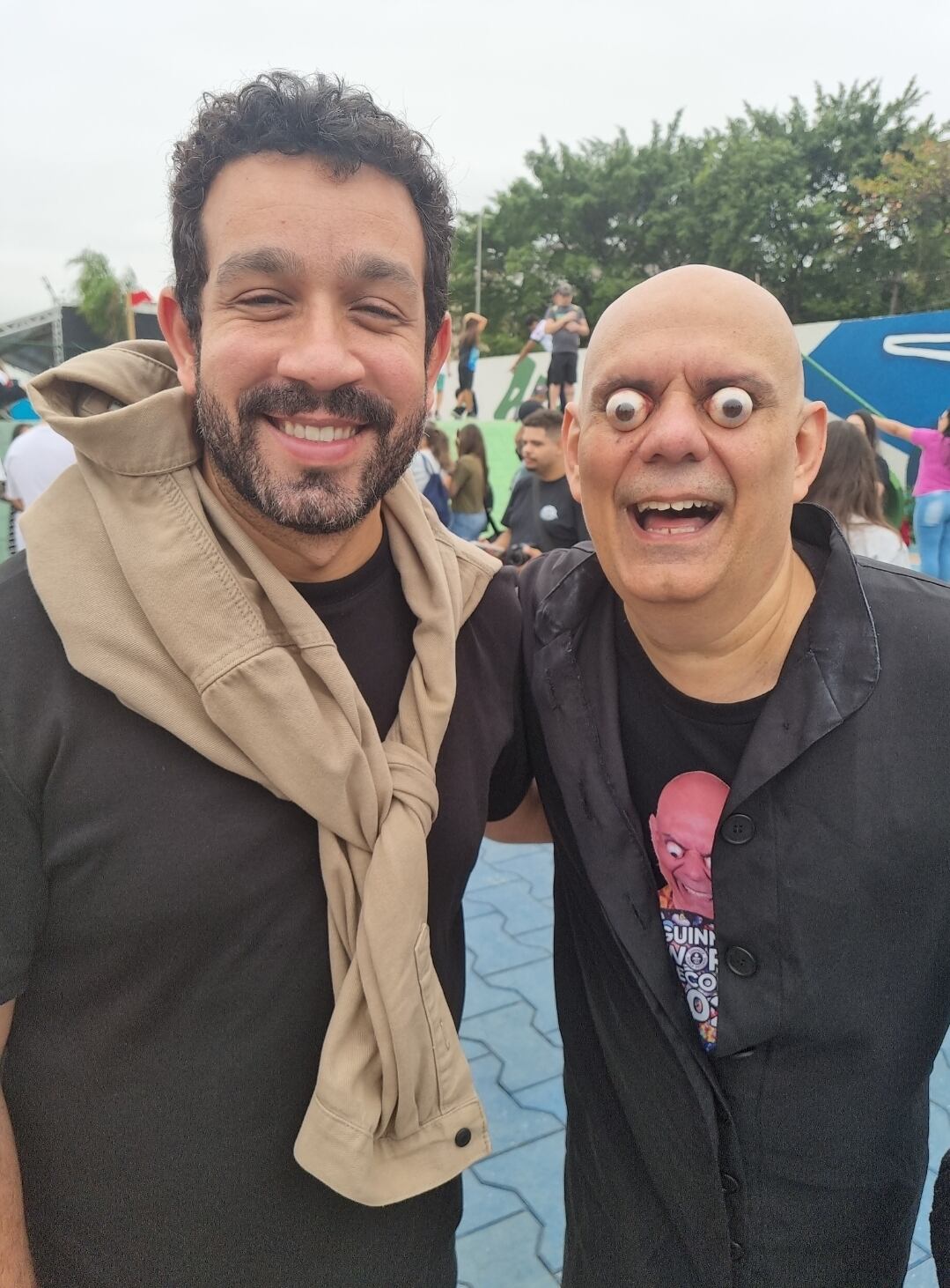 São anos fazendo isso, e ele promete que enxerga bem, viu? Eu o conheci em uma reportagem. Coloquei-o para assustar quem descia de uma escada rolante em um shopping. Fiz amizade na hora! Trocamos contato e, vira e mexe, nos encontramos pela cidade.