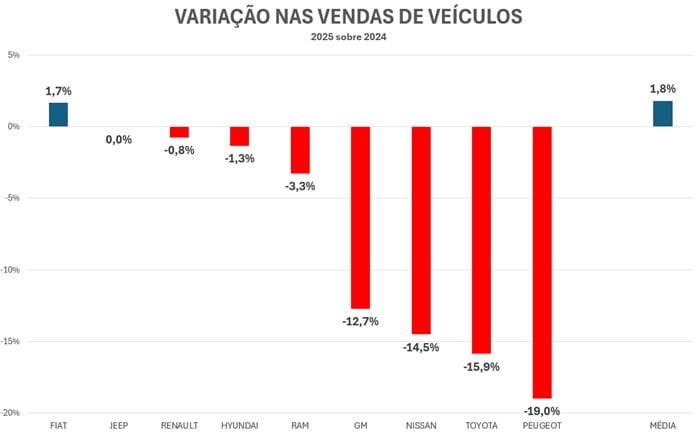 Marcas como Jeep, Renault, Hyundai e Nissan foram as que mais sofreram com a invasão chinesa. O que mais chama a nossa atenção (de forma preocupante) é a retração nas vendas da GM (quase 13%) sem esboçar qualquer tipo de “reviravolta” no curto prazo. Ou seja, a marca irá definhar um pouco mais em 2026.