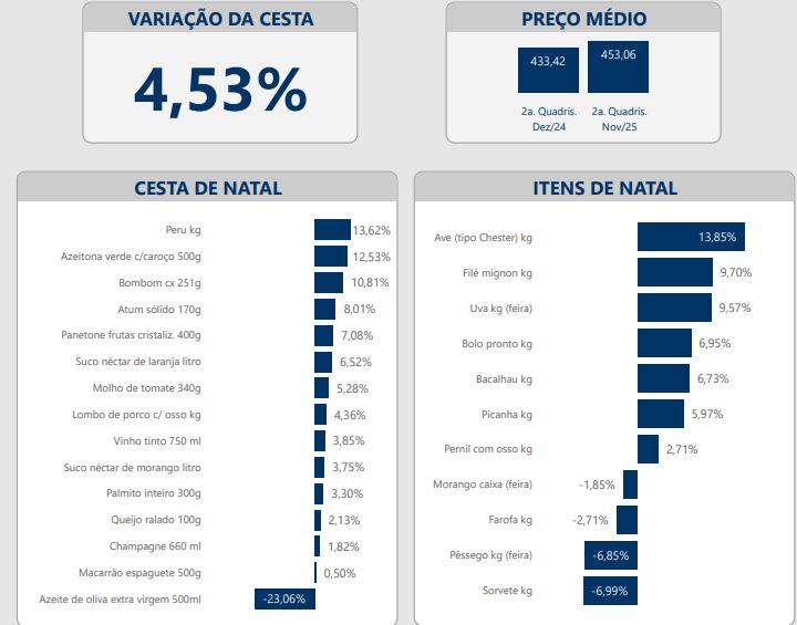 Com base no IPC da segunda quadrissemana de dezembro de 2024 em relação à segunda quadrissemana de novembro de 2025, o preço médio da cesta ficou em R$ 453,06.
