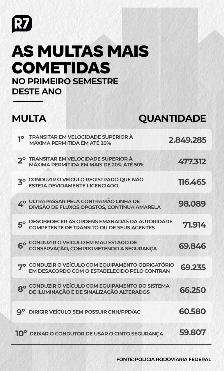 O levantamento é da PRF (Polícia Rodoviária Federal), realizado a pedido do Blog. O total de infrações de janeiro a junho deste ano é de 5.009.574, contra 3.914.573 no mesmo período do ano passado.