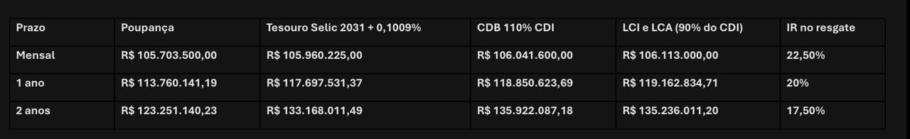 Ela explica que, a partir de dois anos, o cenário muda. Com mais de 361 dias, a alíquota do CDB cai para 17,5%, o que melhora sua eficiência tributária. Isso faz com que o CDB de 110% do CDI passe a liderar a rentabilidade no prazo de 24 meses, chegando a aproximadamente R$ 136 milhões.