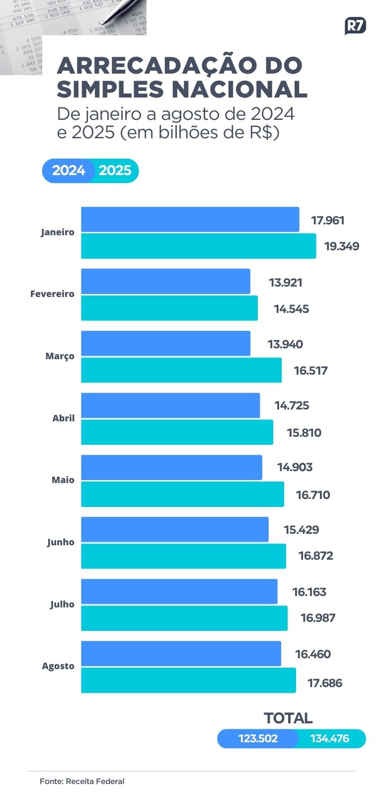 A arrecadação do Simples Nacional registrou um aumento 9% no acumulado do ano, de janeiro a agosto de 2025, em relação ao mesmo período do ano passado, com um volume de R$ 134,4 bilhões.