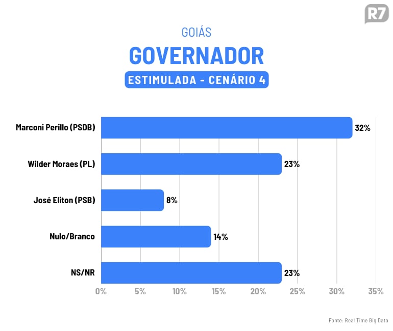 A pesquisa também mostrou um cenário sem Daniel Vilela. Neste caso, Marconi Perillo lidera a corrida, com 32% das intenções. Na sequência, aparece Wilder Moraes, com 23%, e José Eliton (PSB), com 8%.