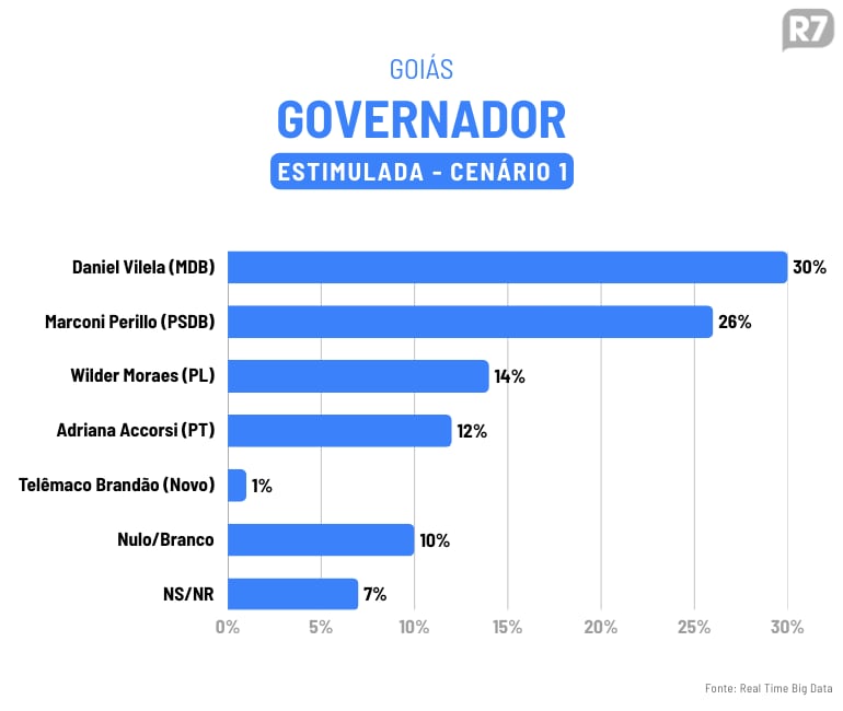No primeiro cenário estimulado — quando o eleitor é apresentado a uma lista de pré-candidatos —, Vilela aparece com 30% dos votos. Na sequência, aparece Marconi Perillo (PSDB), com 26%, Wilder Moraes (PL), com 14%, e Adriana Accorsi (PT), com 12%.