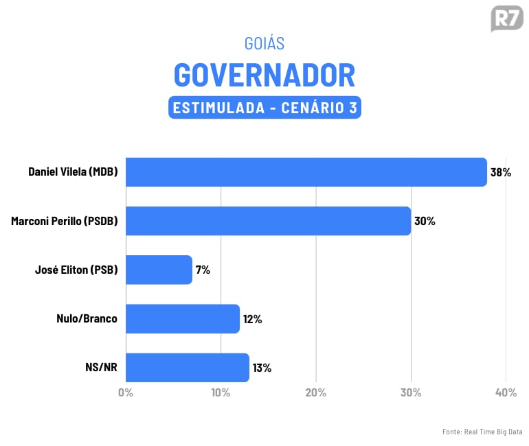 O segundo cenário, Vilela aparece empatado com Perillo, com 32% e 29% dos votos, respectivamente. Em outra análise, o atual vice-governador lidera as intenções com 38% contra 30% de Perillo.