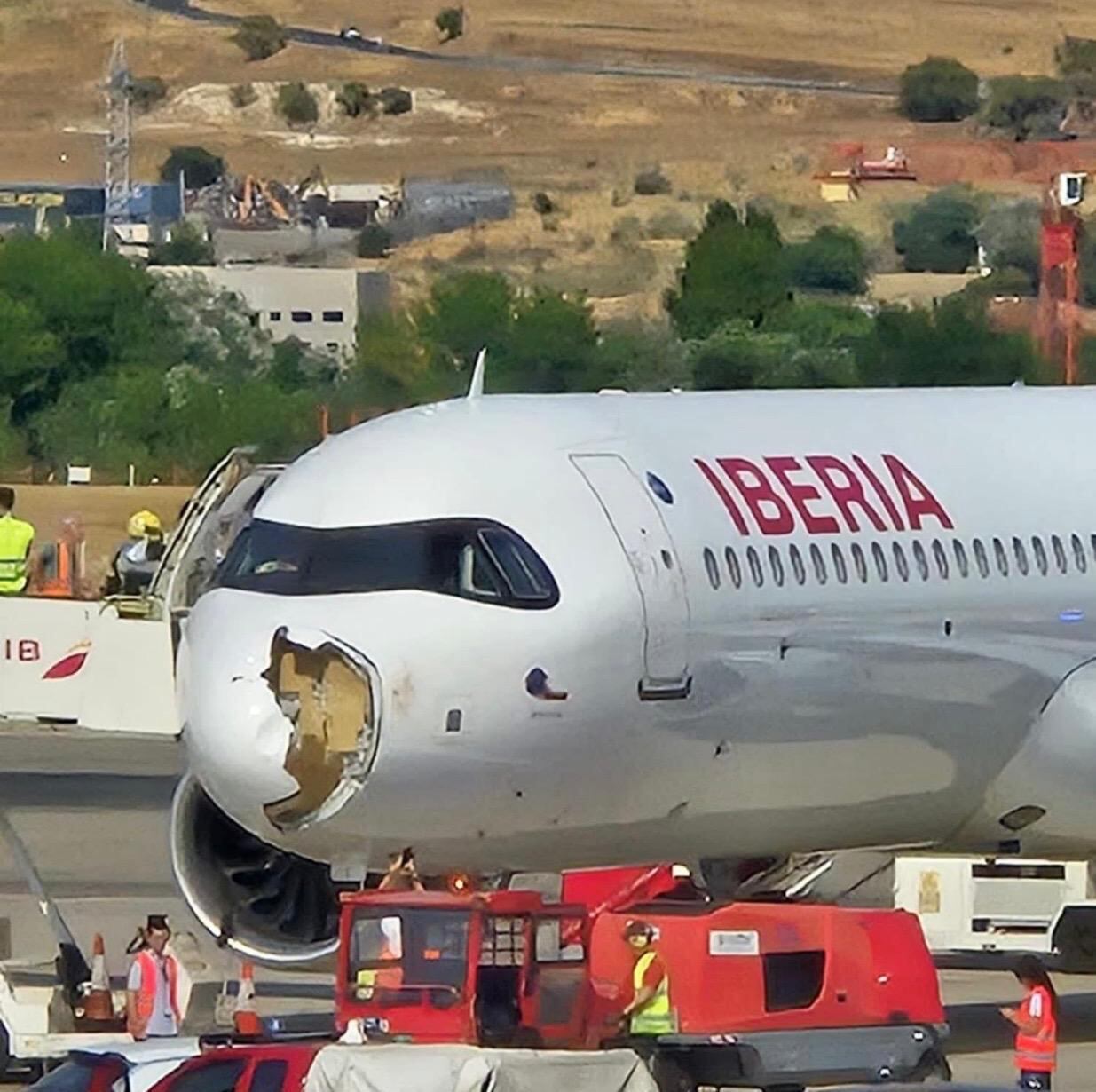 Um Airbus A321Neo da companhia aérea espanhola Iberia sofreu um dano considerável ao colidir com pássaros pouco depois de decolar da pista 36L de Madri, rumo ao aeroporto de Paris Orly, na França.