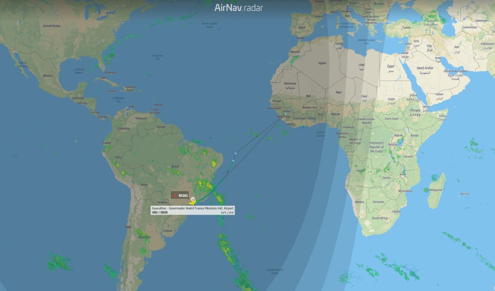 O voo EK247 da Emirates, operado pelo Boeing 777-300ER, de matrícula A6-EGA, pousou às 16h29 no Aeroporto Internacional do Rio de Janeiro, como mostram os dados da AirNav Radar, plataforma mundial de monitoramento de voos, parceira do blog.