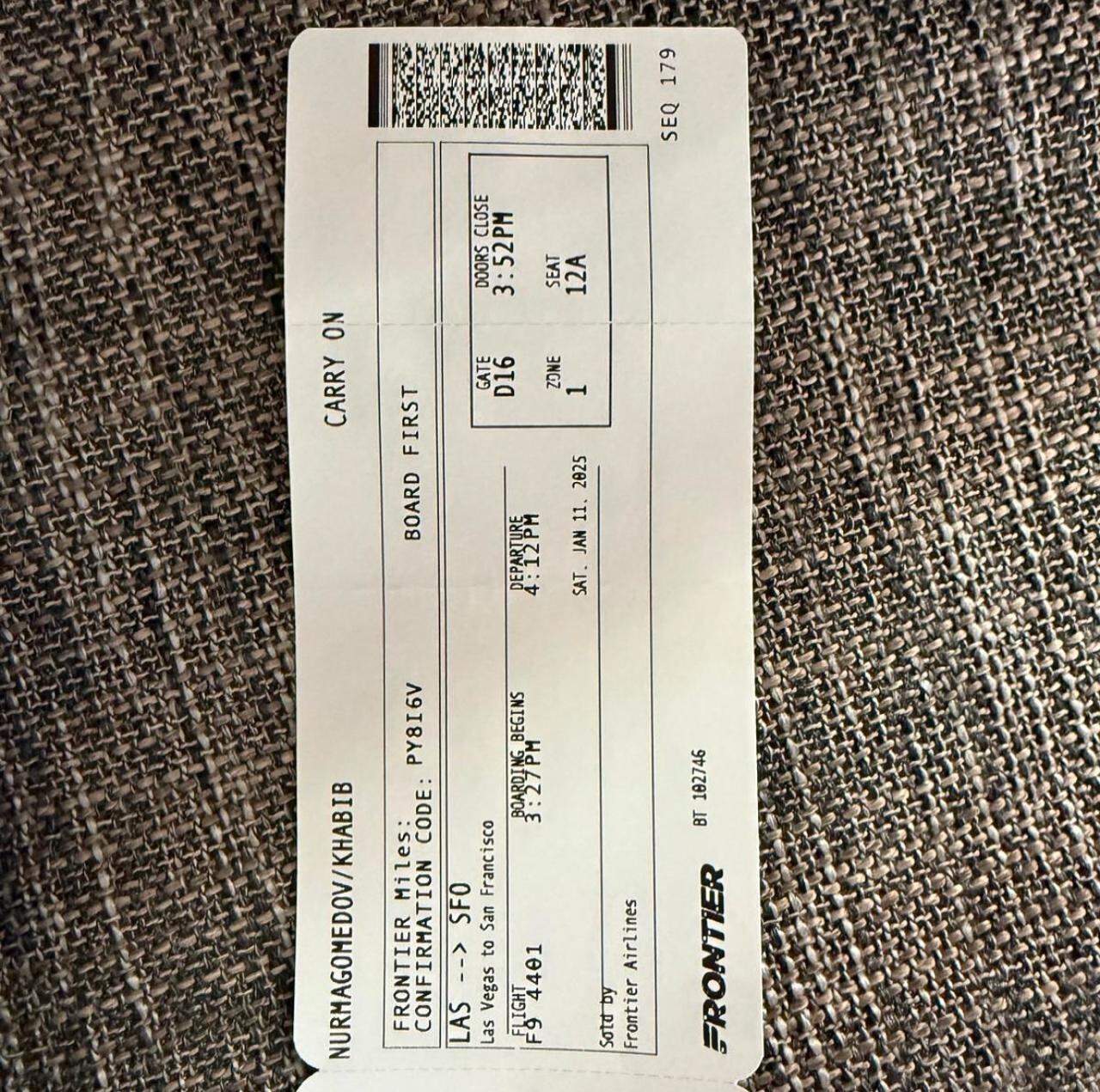 Em sua rede social, Nurmagomedov postou uma foto do bilhete no voo F94401 com seu assento marcado na poltrona 12A (janela), disse que seu inglês - língua em que dialogou com a comissária - é muito “decente”, e que fez o melhor para ficar calmo. “Qual foi a base dela para isto? Racial, nacionalidade ou outra coisa, não posso dizer ao certo”, disse o lutador.