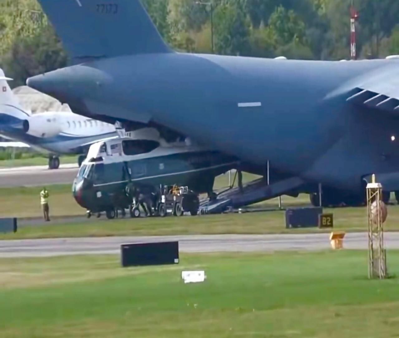 Vídeo registra aeronave ‘Marine One’ sendo retirada do enorme avião C-17 Globemaster III