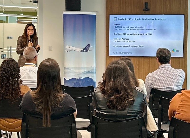 Gabriela Rodrigues, líder de ESG na Copastur, contou durante o encontro que a sustentabilidade está no centro da estratégia da empresa, com foco no valor “impacto socioambiental”, por meio de ações frequentes e um comitê dedicado ao tema, além do apoio aos clientes na gestão de carbono para mensurar, reduzir e compensar emissões. Ela destacou a parceria com fornecedores que compartilham esse valor, o compromisso com os movimentos do Pacto Global da ONU, SBTI e selo GHG Protocol, e a importância da COP 30 como marco global para o clima e a urgência em agir agora, definindo o propósito da parceria com a Lufthansa como “aprender, conectar e ampliar o impacto positivo”.