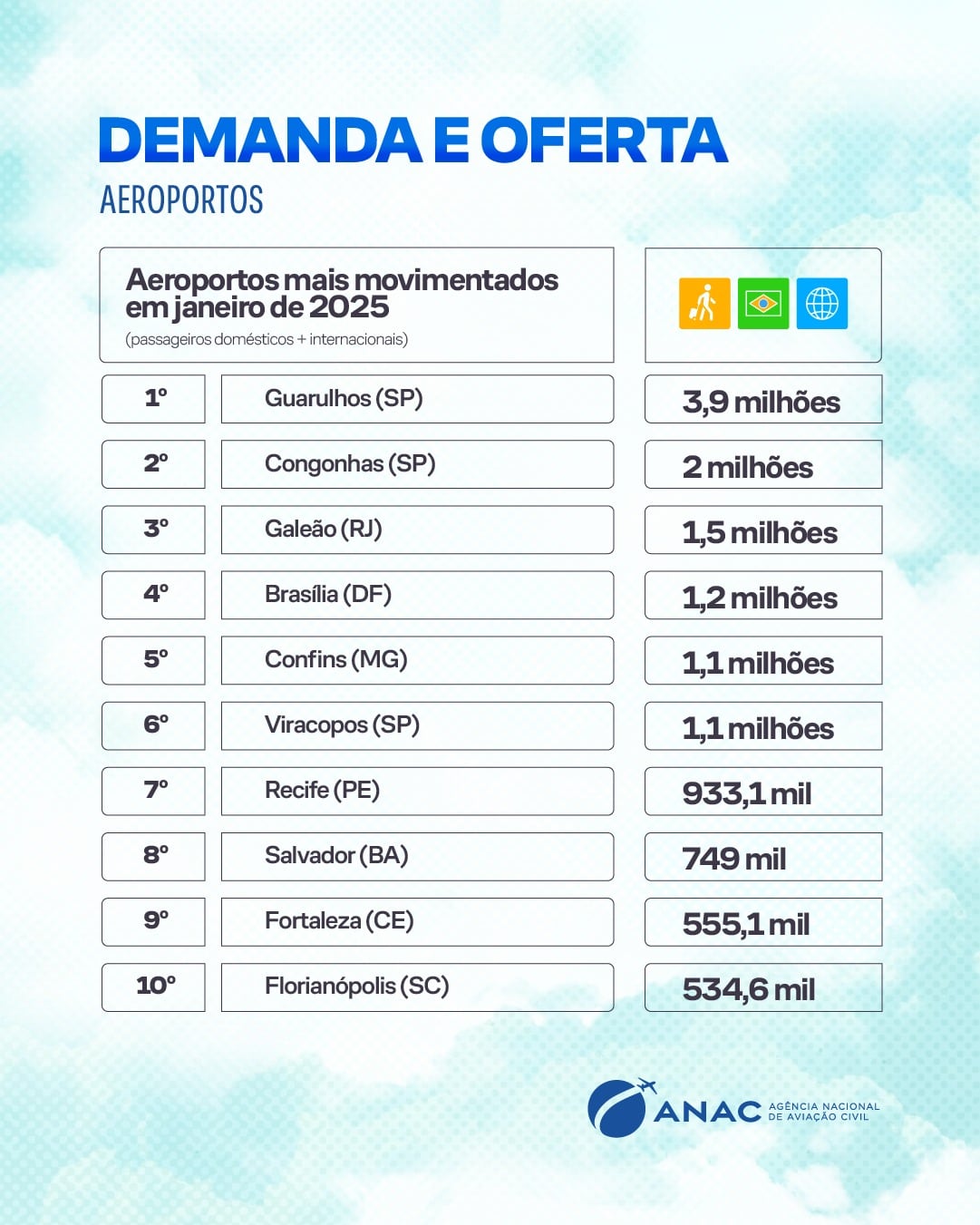O fluxo de passageiros do mercado internacional de aviação civil no Brasil registrou, pelo nono mês seguido, a melhor movimentação em janeiro desde o início da série histórica. No mês de janeiro de 2025, passaram pelos aeroportos brasileiros 2,7 milhões de passageiros com bilhetes marcados em voos internacionais, recorde de movimentação para o mês e maior quantitativo em um mês desde janeiro de 2000. Foi um crescimento de 15,2% em relação a janeiro de 2024.