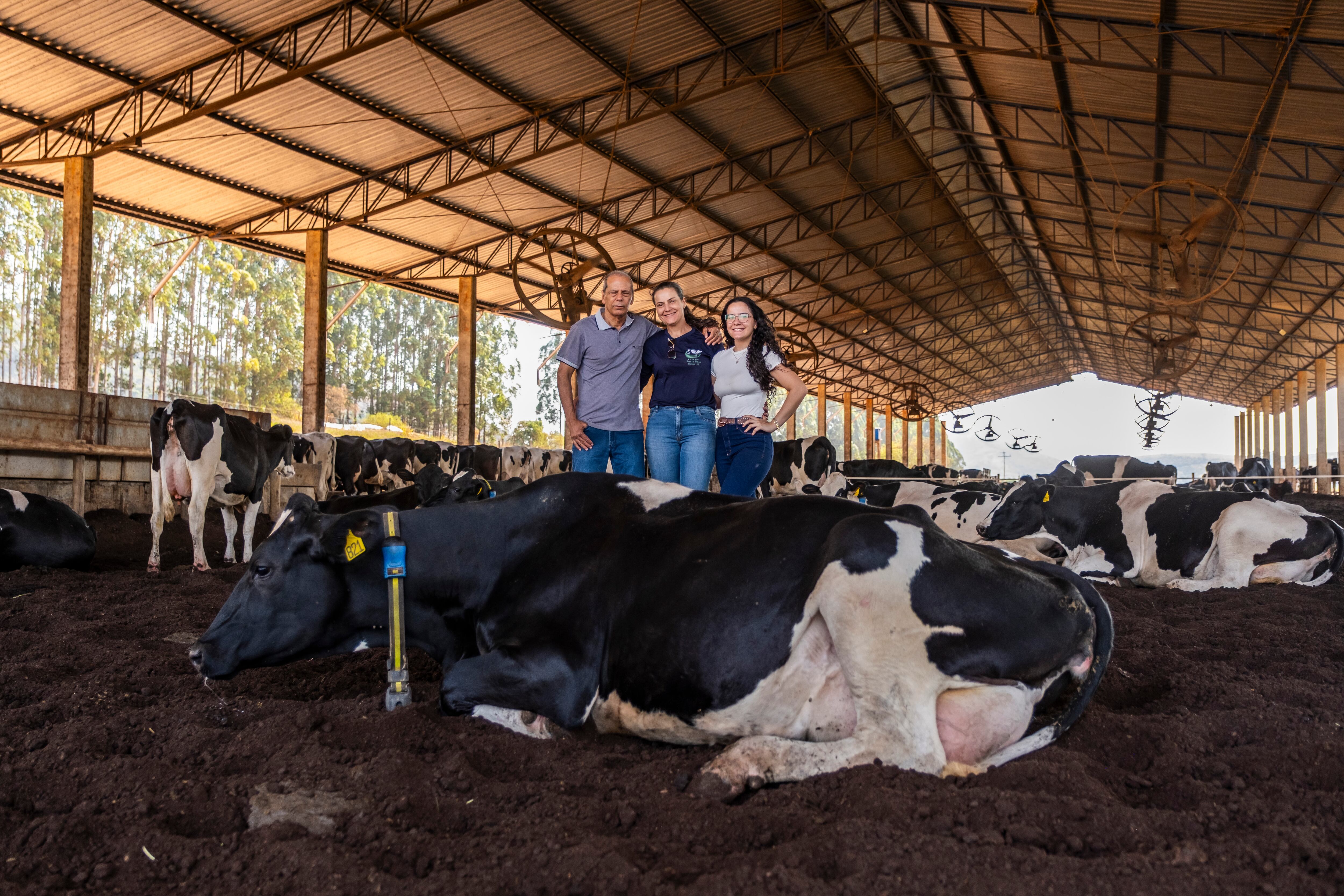 Naisser, Rejane e sua equipe cuidam hoje de 160 vacas em lactação, que produzem cerca de 6 mil litros de leite por dia. Estão na pecuária leiteira há 30 anos e fornecem matéria-prima para a Danone Brasil há 23.