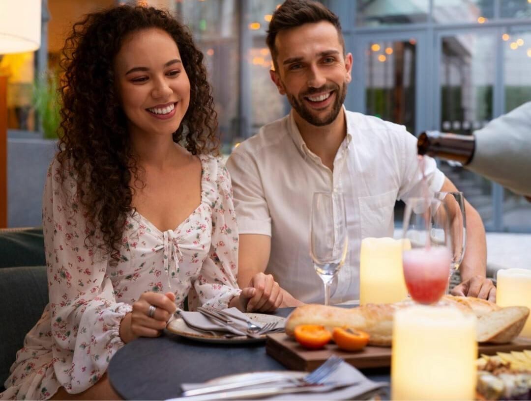 Já na VilaMoura, a experiência promete ser ainda mais completa. O jantar começa com uma mesa de frios (pães de fermentação natural e bruschettas), seguida por uma entrada quente (burrata com salsa trufada e torradas ou polenta gratinada com queijo serra da canastra). Depois, o casal poderá escolher entre mini caprese VilaMoura ou ceviche de Saint Peter como entrada fria, antes do prato principal — que pode ser medalhão de filé mignon ao molho roti com risoto trufado, filé de salmão grelhado com mousseline de batata-baroa e aspargos, ou ravioli de muçarela de búfala ao molho rústico. Para finalizar, as sobremesas incluem gota duo de chocolate com couli de morango ou entremet de pistache. O valor é de R$ 250 por pessoa ou R$ 450 o casal, incluindo bebidas como água, refrigerante, espumante, vinho tinto e chopp.