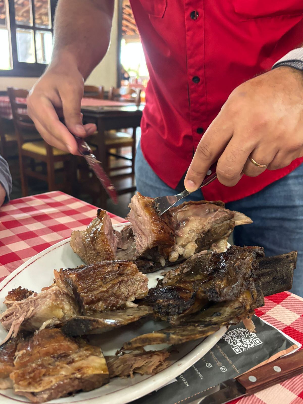 Thiago é o nosso garçom. Sim, sempre que chegamos, já o procuramos pela mesa. Ele já sabe exatamente o que vamos pedir: o ponto da carne, se queremos mais torresmo ou mandioca... e por aí vai.