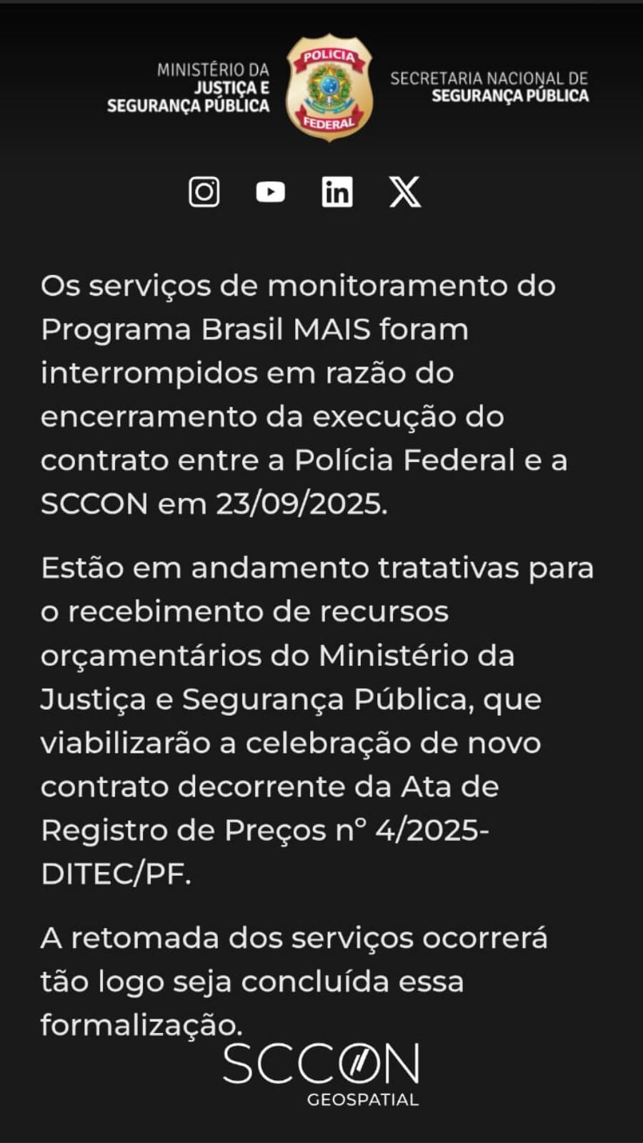 “Os serviços de monitoramento do Programa Brasil MAIS foram interrompidos em razão do encerramento da execução do contrato entre a Polícia Federal e a SCCON em 23/09/2025.