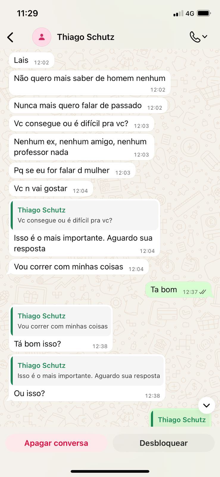 A reportagem teve acesso a mensagens de WhatsApp trocadas entre os dois, nas quais ele diz não querer que ela entre em contato com nenhum outro homem — depois de vê-la comentando a foto de um professor da faculdade em uma rede social.