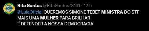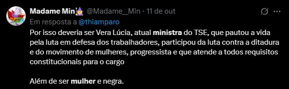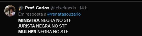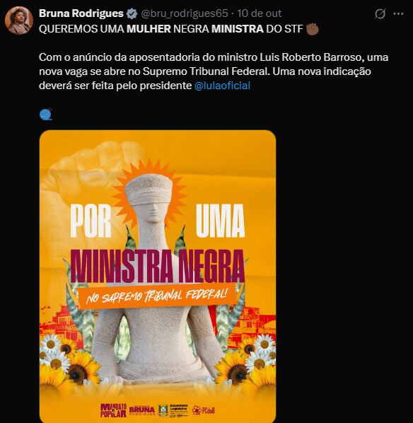 “Essa é sua terceira chance de corrigir uma injustiça histórica, indicando a primeira mulher negra para o STF”, diz o texto. “Essa escolha representaria um passo concreto na direção da equidade racial e de gênero dentro da mais alta instância do Judiciário brasileiro, após 134 anos de ausência.”