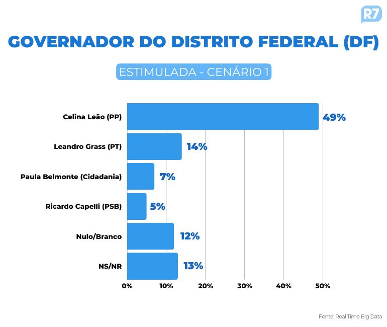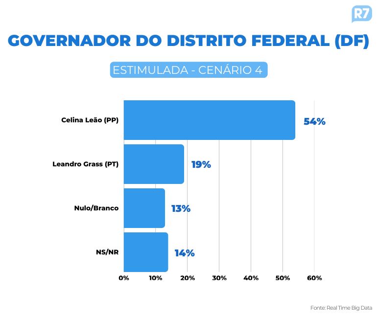 Pesquisa do instituto Real Time Big Data para o Governo do Distrito Federal indica que a vice-governadora Celina Leão (PP) lidera em todos os cenários estimulados, em que são apresentados os nomes dos candidatos.