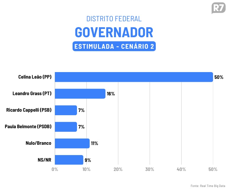 No segundo cenário, sem Arruda, Celina lidera com 50% das intenções de voto. Em seguida, Grass aparece com 16%, e Cappelli e Belmonte seguem empatados, ambos com 7%.