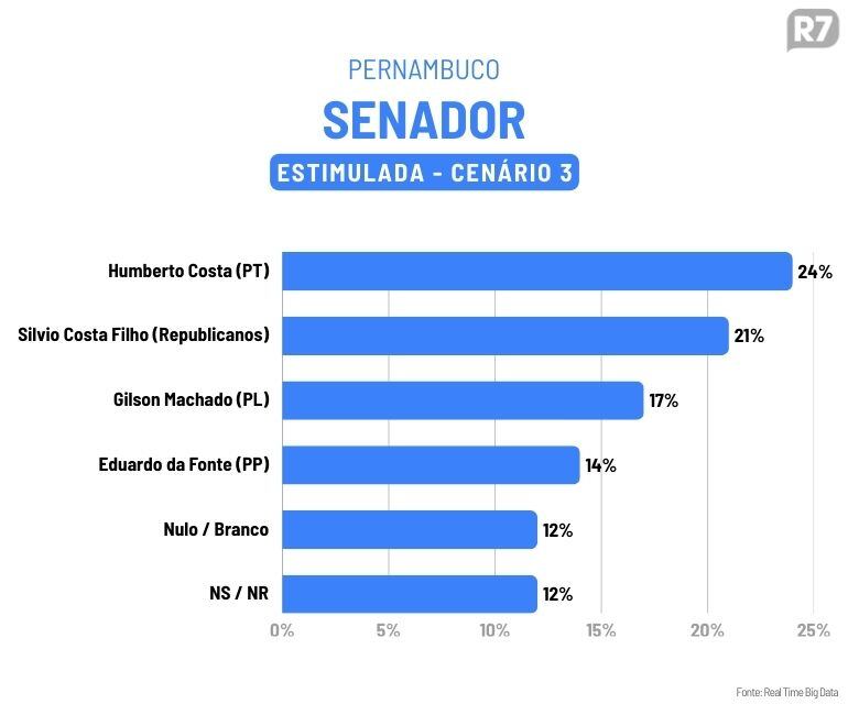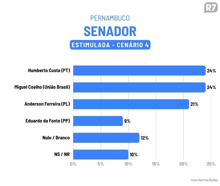Na primeira situação estimulada — quando os entrevistadores oferecem opções de respostas ao público —, João Campos aparece com 51% das intenções de voto. A atual governadora do estado, Raquel Lyra (PSD), fica em segundo lugar, com 31%. O levantamento também inclui os nomes de Eduardo Moura (Novo) e Ivan Moraes (PSOL).