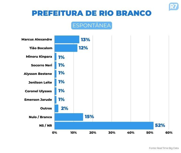 No cenário espontâneo, quando o entrevistador não cita os candidatos, Marcus Alexandre (MDB) e Tião Bocalom (PL) aparecem tecnicamente empatados outra vez e com um percentual ainda mais apertado: 13% e 12%, respectivamente.