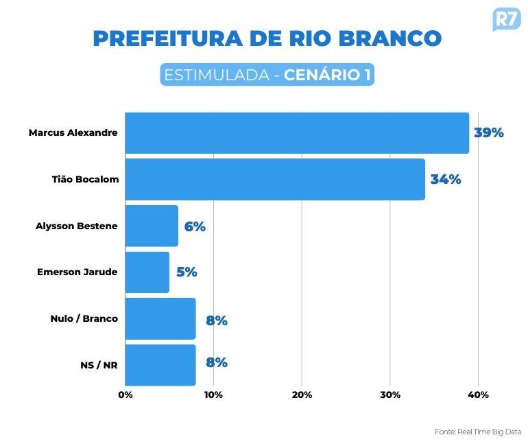 Na disputa pela Prefeitura de Rio Branco, capital do Acre, Marcus Alexandre (MDB) e Tião Bocalom (PL) estão tecnicamente empatados, segundo pesquisa do RealTime Big Data divulgada nesta terça-feira (9). No cenário estimulado, quando os nomes dos candidatos são apresentados ao eleitor, eles aparecem com 39% e 34% das intenções de voto, respectivamente, e a margem de erro é de três pontos percentuais.