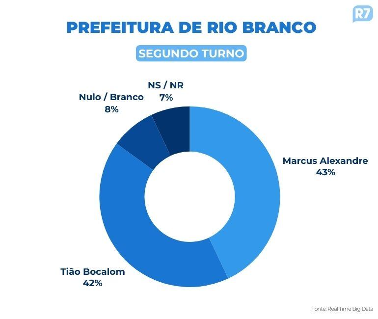 Numa simulação de segundo turno, Marcus Alexandre (MDB) tem 43% e Tião Bocalom (PL) aparece com 42%. Votos nulos/brancos somam 8%, e 7% dos entrevistados não sabem ou não responderam.