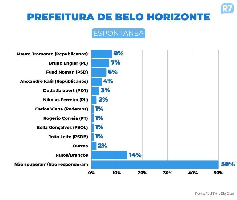Ao todo, a pesquisa conta com três cenários estimulados, apresentados com alguns dos candidatos e a não participação de outros. No primeiro cenário, Tramonte aparece com 26% da intenção de votos, seguido por Bruno Engler (PL) e Duda Salabert (PDT).