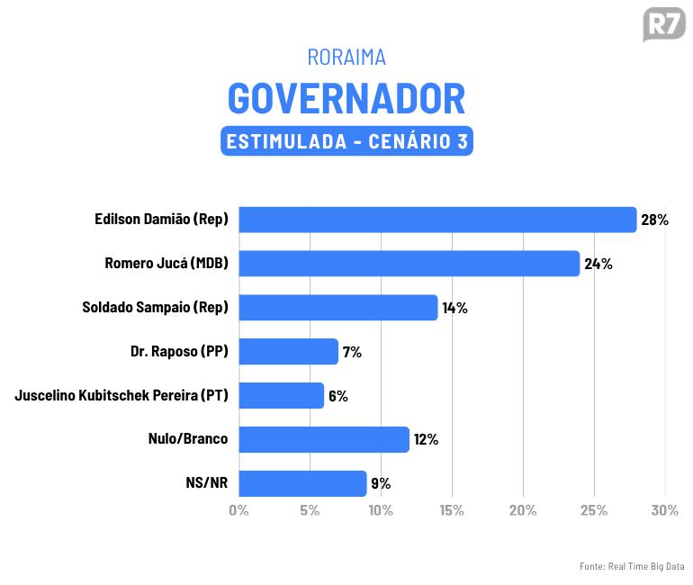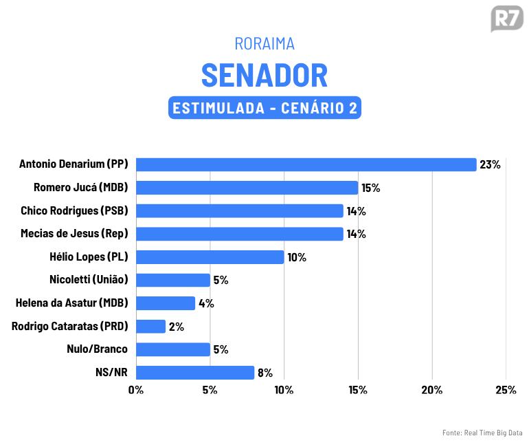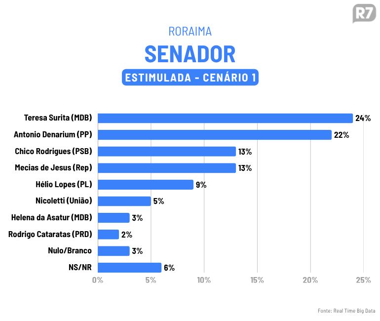 A pesquisa também projetou como seria a disputa para o Senado. Teresa Surita lidera com 24%, seguida pelo governador Antonio Denarium (PP), com 22%.