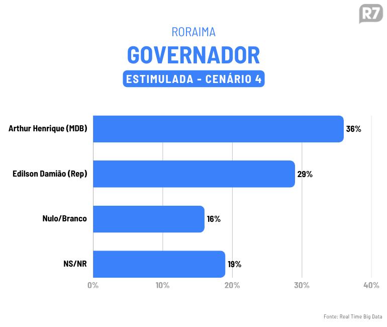Ao todo, foram testados quatro cenários. Na segunda possibilidade, o prefeito de Boa Vista, Arthur Henrique (MDB), tem 31% dos votos, contra 25% de Edilson Damião.