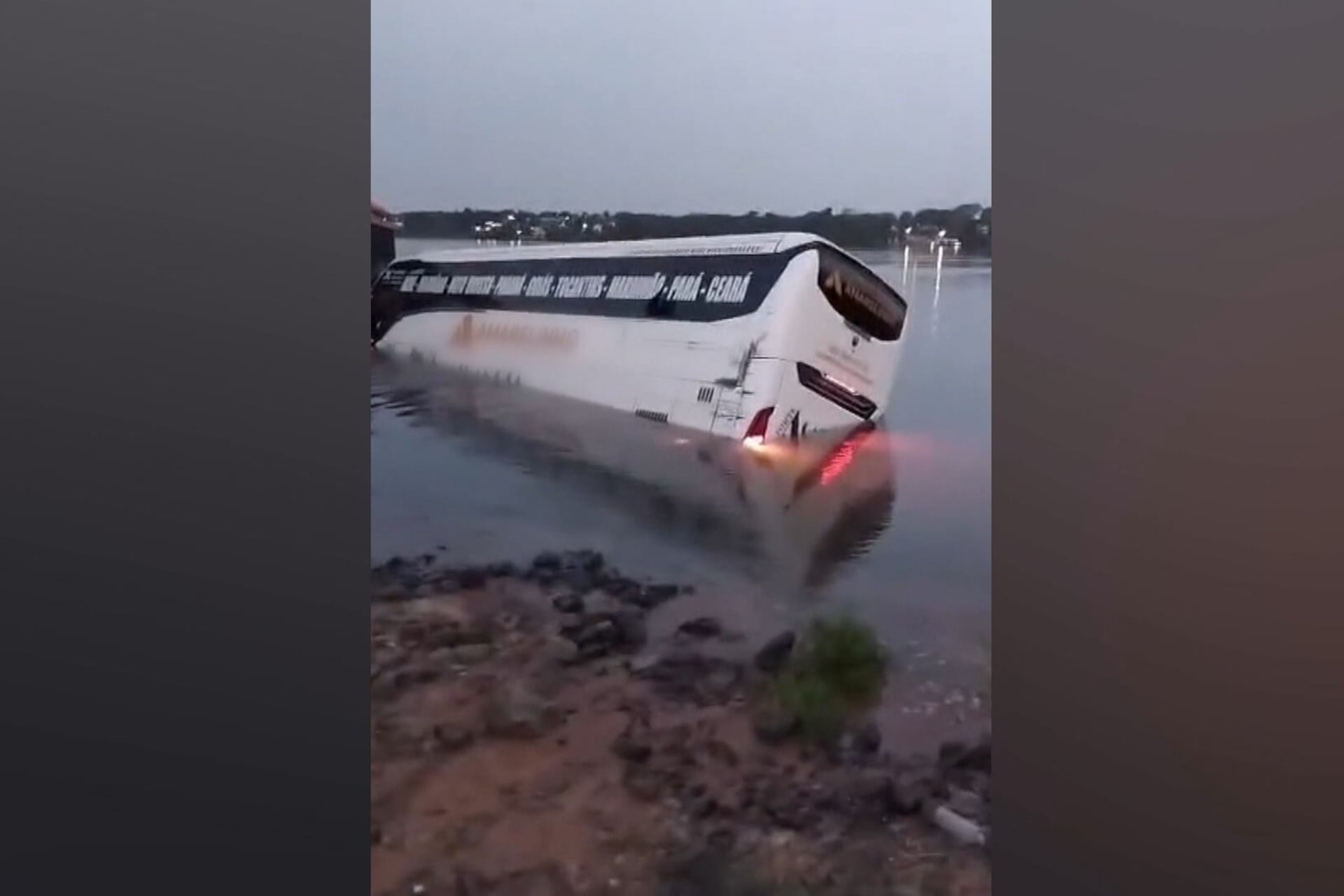 Ônibus faz manobra para entrar em balsa, mas cai em rio