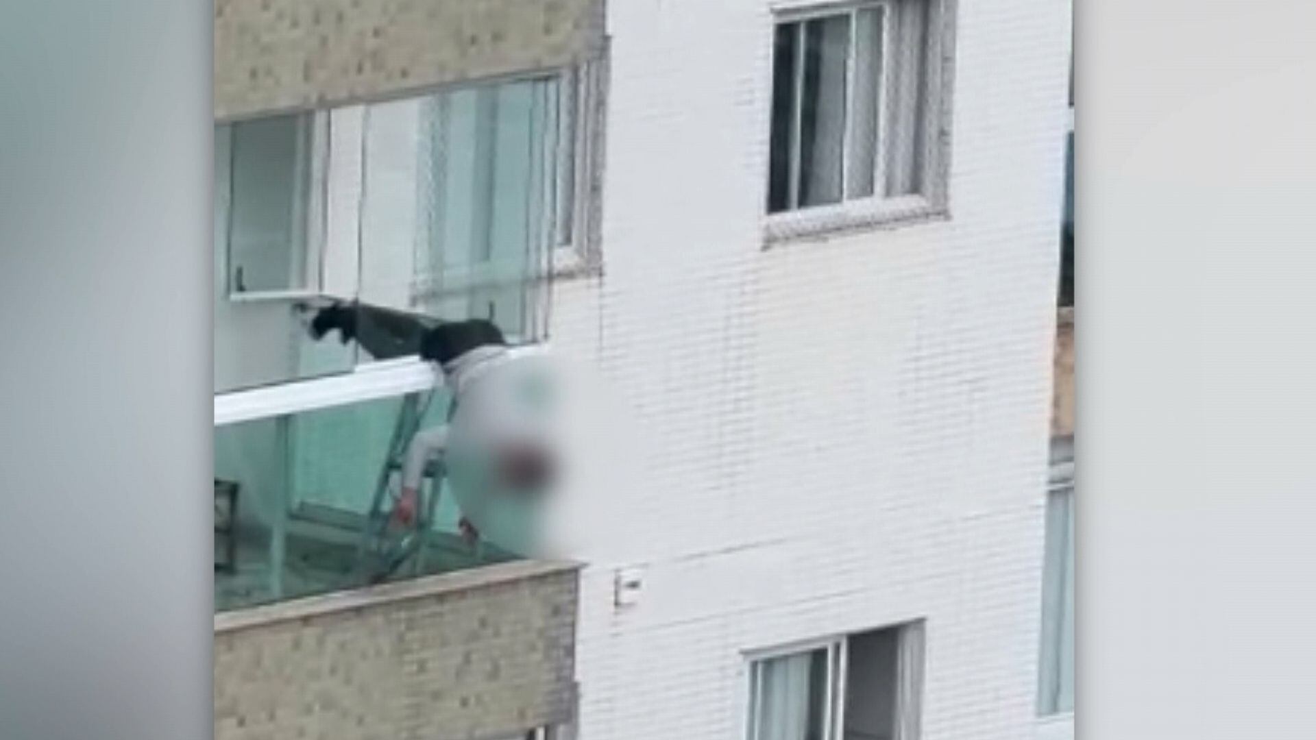 Homem se arrisca ao ficar pendurado em sacada para instalar rede de proteção