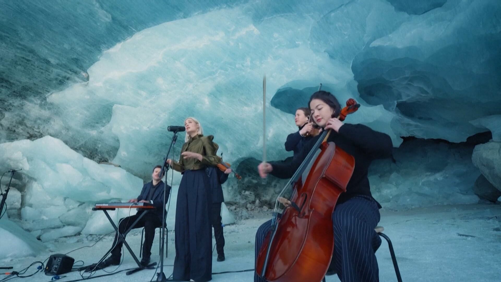 Cantora faz apresentação em meio ao derretimento de geleira nos Alpes suícos