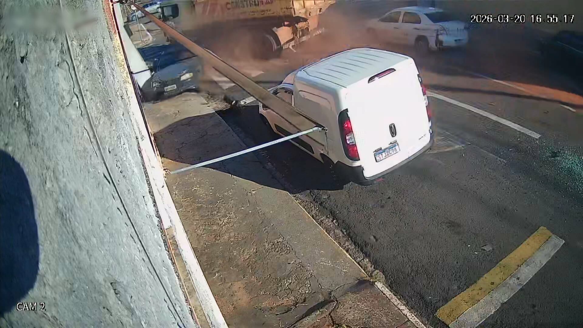 Câmeras de segurança flagraram o momento em que o veículo atinge a bomba